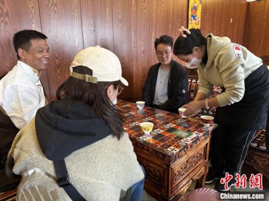 資料圖為長(zhǎng)江源村的一家藏餐吧迎來(lái)客人。 中新社記者 李雋 攝