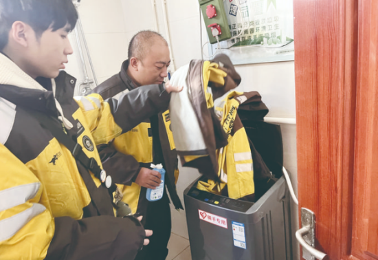 1月19日一早,記者走進(jìn)服務(wù)驛站時(shí),已有幾位騎手在此休息。干凈整潔的床鋪、沙發(fā)、桌椅,晾衣架、飲水機(jī)、微波爐、礦泉水、應(yīng)急藥品等一應(yīng)俱全!斑@個(gè)服務(wù)驛站特別好,旁邊就是美團(tuán)的工作站點(diǎn),每天開完早會(huì)或者不忙時(shí),我們都會(huì)來這休息,吃個(gè)飯、喝口水,告別風(fēng)餐露宿。衣服臟了還可以用洗衣機(jī)洗,特別省心,就像家一樣!蓖赓u員郭蕊說。