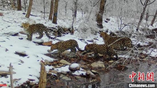 東北豹“四口之家”罕見亮相東北虎豹國家公園