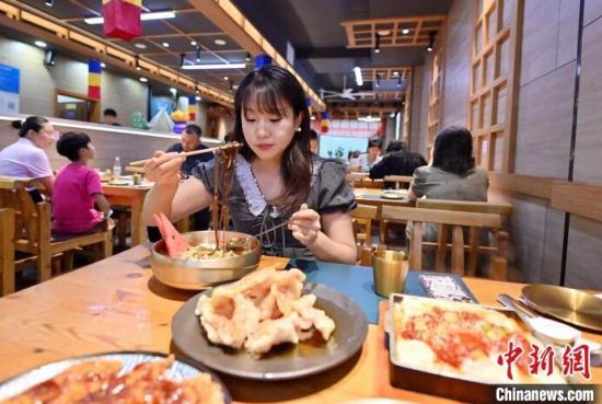 7月23日,吉林長春,食客體驗(yàn)延吉冷面配鍋包肉的“冷熱配”吃法!≈行律缬浾 張瑤 攝