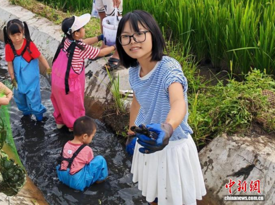 8月11日,2025年吉林省臺(tái)聯(lián)第五屆兩岸婚姻家庭親子夏令營走進(jìn)吉林市,營員們在稻田體驗(yàn)抓螃蟹!↑S子珊 攝