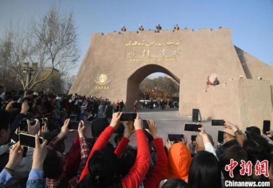 圖為來(lái)自五湖四海的游客在喀什古城觀賞開(kāi)城儀式。 孫亭文 攝