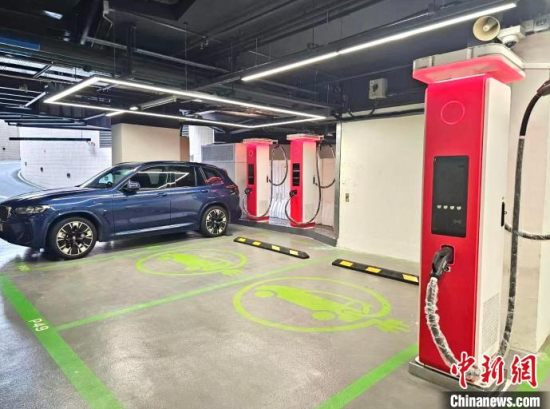 圖為華為在香港將軍澳藍塘匯商場停車場內(nèi)設(shè)置的充電站!∠愀廴A為國際有限公司供圖