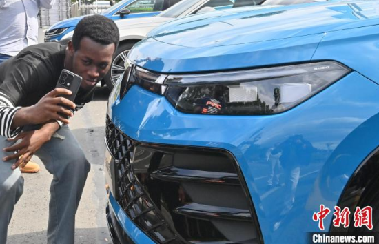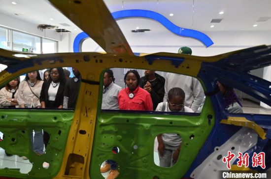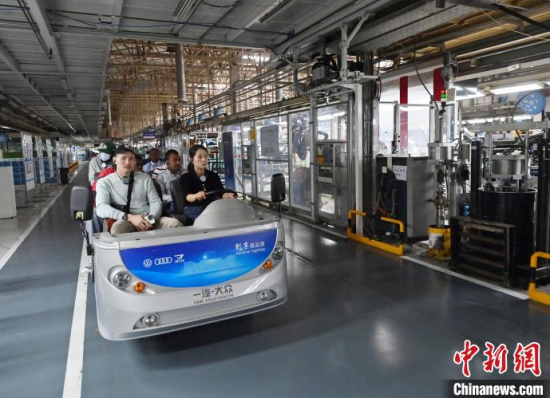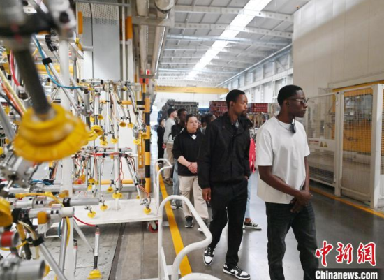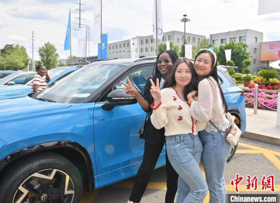 5月23日,吉林長(zhǎng)春,留學(xué)生在和汽車合影。當(dāng)天,二十余名留學(xué)生走進(jìn)一汽-大眾長(zhǎng)春生產(chǎn)基地,近距離感受中國(guó)汽車制造業(yè)的智能化發(fā)展。中新社記者 張瑤 攝