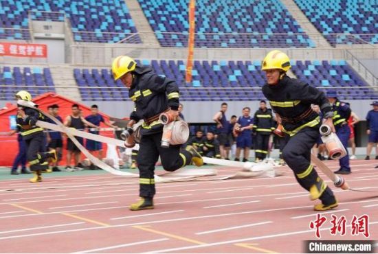 消防指戰(zhàn)員在進行一人兩盤水帶連接!埇 攝
