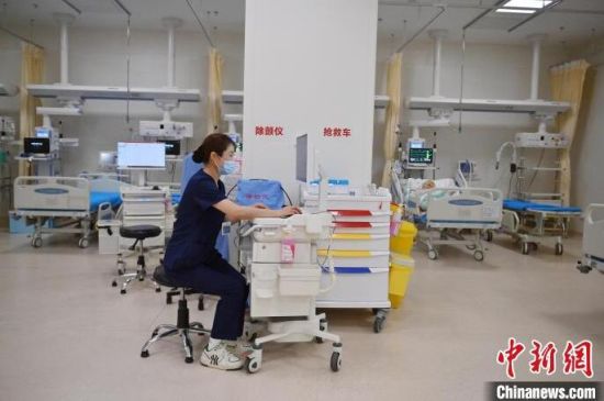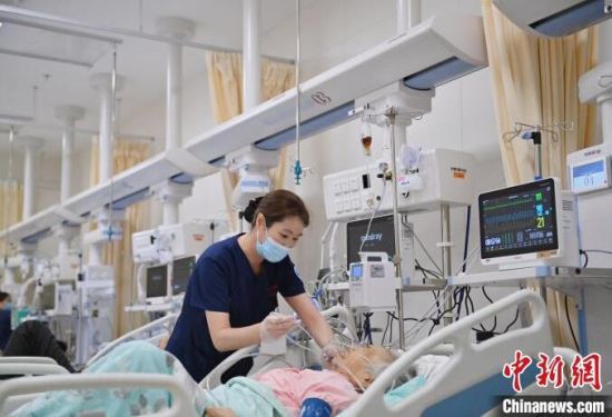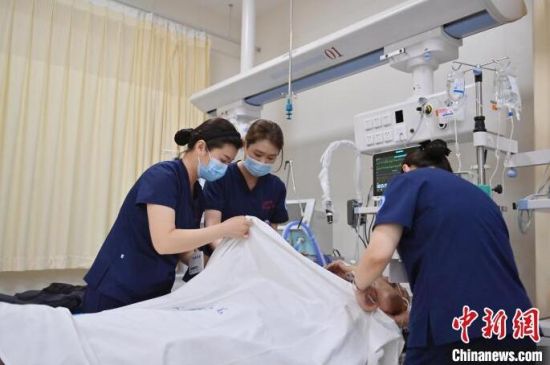 張力(左)對急診監(jiān)護區(qū)每位患者的情況都爛熟于心。護士們與患者朝夕相處,細心照護,關(guān)系已經(jīng)超出了普通的醫(yī)患關(guān)系。張力說:“他們的親屬不能在身邊陪伴,但是我們每天可以和他們在一起,我們和這些患者的關(guān)系像親人一樣。” 張瑤 攝