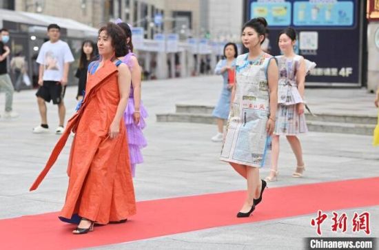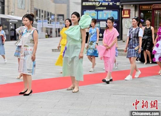 6月5日,吉林長春,模特身穿綠色環(huán)保時裝走秀。值此世界環(huán)境日來臨之際,長春開展“塑制霓裳·環(huán)保領航”綠色環(huán)保時裝秀表演活動。民眾將廢舊的報紙、塑料袋等廢舊物品變成了美麗的衣裳,宣傳環(huán)保意識。張瑤 攝