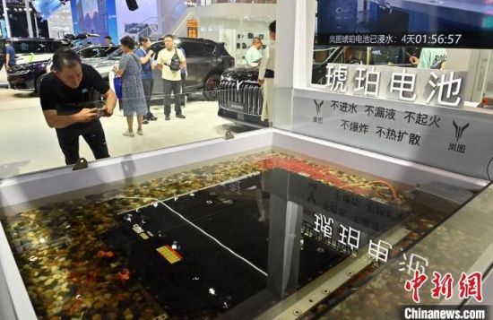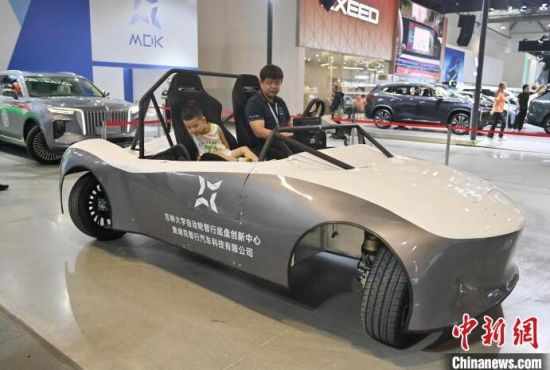 7月13日,吉林長春,參展商在展示安裝了自動輪智行底盤汽車的原地轉(zhuǎn)向功能。在第21屆長春國際汽車博覽會上,汽車產(chǎn)業(yè)的前沿技術(shù)成果集中亮相,吸引參觀者的目光。(中新社記者 張瑤/攝)