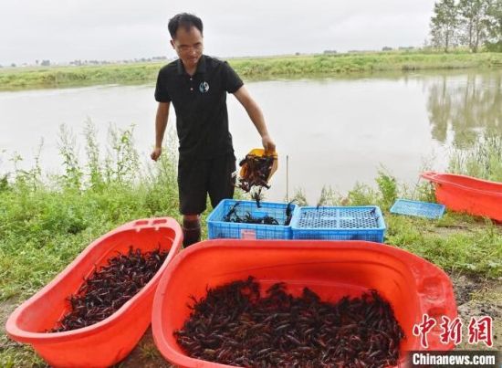8月22日,在吉林省伊通縣三聯(lián)水庫灌區(qū)的小龍蝦苗培育基地,工作人員在展示小龍蝦。該基地科研團(tuán)隊(duì)在成功培育出了適應(yīng)北方寒地環(huán)境小龍蝦苗的同時,還創(chuàng)新探索出稻田養(yǎng)殖蝦蟹新模式,通過生態(tài)良性循環(huán)提升稻米品質(zhì),也能更好地保護(hù)和利用黑土地。中新社記者 張瑤 攝