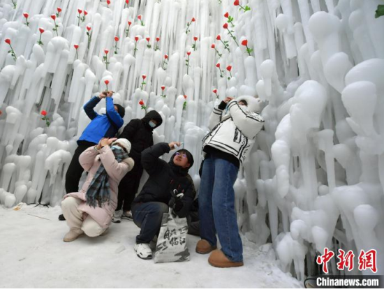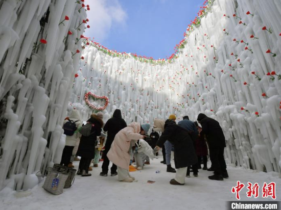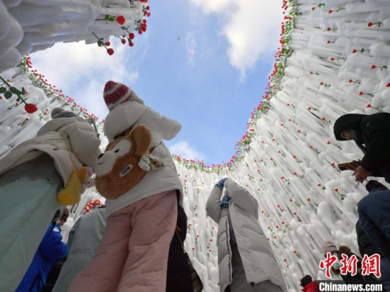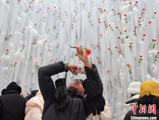 12月26日,吉林長(zhǎng)白山,游客在冰洞內(nèi)打卡。進(jìn)入雪季,長(zhǎng)白山推出“愛(ài)心冰封玫瑰”吸引大量游客打卡拍照,冰洞內(nèi)被玫瑰道具環(huán)繞,洞頂呈心形,充滿(mǎn)浪漫氣息。
