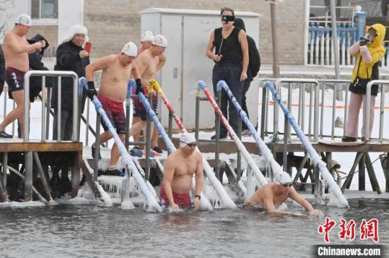 2月7日,在長(zhǎng)春市南湖公園內(nèi),冬泳愛(ài)好者在零下19攝氏度的嚴(yán)寒天氣中冬泳鍛煉身體。 中新社記者 張瑤 攝