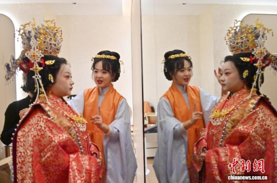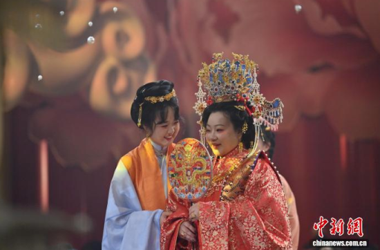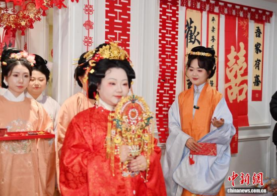 1月9日,吉林長(zhǎng)春,任鴻洋(右)手持熏香入場(chǎng)。長(zhǎng)春“00后”女孩任鴻洋是一位漢服愛好者,出于對(duì)傳統(tǒng)文化的熱愛,她成為一名執(zhí)禮喜娘。她已為50多對(duì)新人舉辦中式婚禮,通過優(yōu)雅的古典儀式,不僅推廣傳統(tǒng)婚俗,更致力于傳播漢服文化。她希望以年輕的方式,讓千年“中式浪漫”在現(xiàn)代生活中煥發(fā)新光彩。中新社記者 張瑤 攝