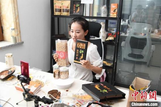 吉林參商正在網(wǎng)絡(luò)平臺直播銷售人參。 張瑤 攝